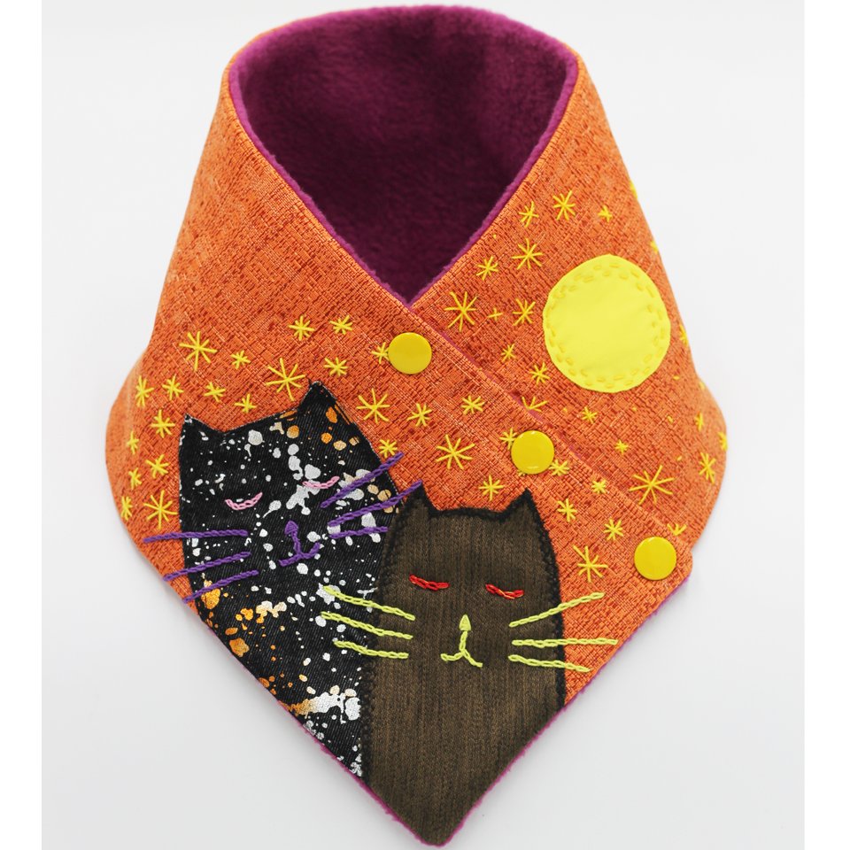 cuello realizado con reutilización textil, forrado en polar, con broches metálicos ,gatos de tela , luna y estrellas bordados a maquina y a mano .